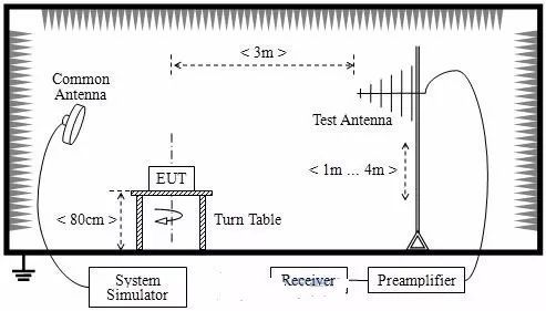暗室布置:EUT 置于轉臺(3m/10m 測試距離),接收天線按高度掃描(1–4m),轉臺旋轉 360° 覆蓋全方向。